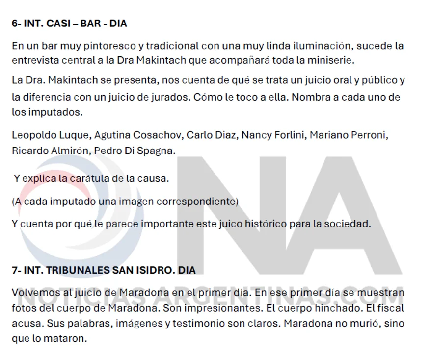 "Fotos del cuerpo de Maradona. En el juicio declaran los policías que hicieron el procedimiento del traslado del cuerpo. Es el turno del comisario Lucas Borges. La Dra Makintach escucha las declaraciones del policía", detalla otra parte que iba a aparecer en la producción.