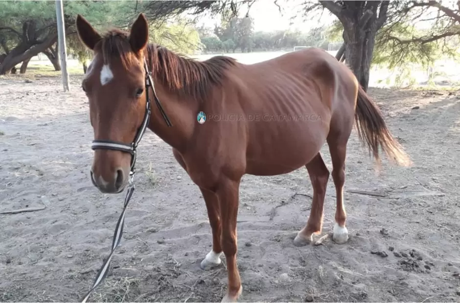 Ayer, a las 19:00, en la ruta nacional N° 38, a la altura del establecimiento de Ganadería Provincial, Capayán, efectivos de la División Policía Montada, dependiente de la Dirección de Unidades Especiales de la Policía de la Provincia, procedieron al secuestro de un caballo pelaje negro frontino, con marca de fuego en pierna izquierda, parte superior “B” e inferior “89”, y de una yegua tostada frontina, sin marca de fuego visible.