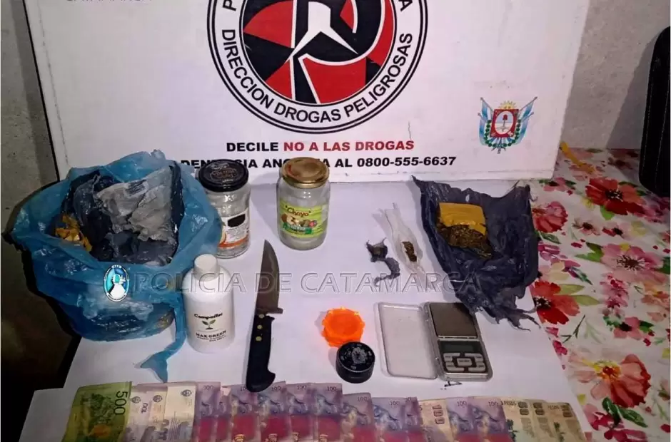 Luego de realizar tareas investigativas con conocimiento del Juzgado Federal, a cargo del Dr. Miguel Ángel Contreras, Secretaría a cargo del Dr. Luis Alberto Baracat Marenco, los efectivos materializaron un allanamiento en una vivienda de calle Luis Pacheco al 200. Del lugar, procedieron al secuestro de un 1,108 Kg. de Marihuana, una (01) balanza digital, dos (02) frascos de vidrio conteniendo restos de una sustancia tipo herbácea, varios recortes de nylon y trozos de cinta de embalar de color marrón, un (01) frasco de fertilizante, dos (02) trituradores, un (01) teléfono celular y la suma de diez mil trescientos cincuenta pesos ($10.350) en efectivo.