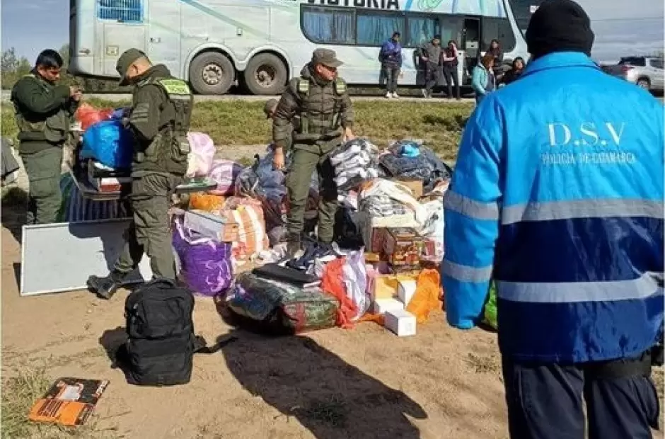 En un control vehicular e identificación de personas en el puesto caminero El Portezuelo, ubicado en la Ruta Nacional Nº 38, los numerario de la Dirección Vial inspeccionaron un colectivo de larga distancia y notaron que los pasajeros transportaban varios elementos sin la documentación correspondiente.