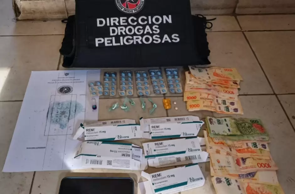 En el lugar, los policías secuestraron envoltorios de plástico con sustancia tipo polvo, de color blanco, que al ser sometida a la prueba de campo correspondiente arrojó como resultado positivo para probable cocaína, que quedó en calidad de secuestro al igual que 57 pastillas de Midazolam de 15 mg., cinco comprimidos de Clonazepam, un teléfono celular y la suma de$23.500 en efectivo, que fueron puestos a disposición de la Justicia interviniente, desde donde se impartieron las medidas a seguir.
