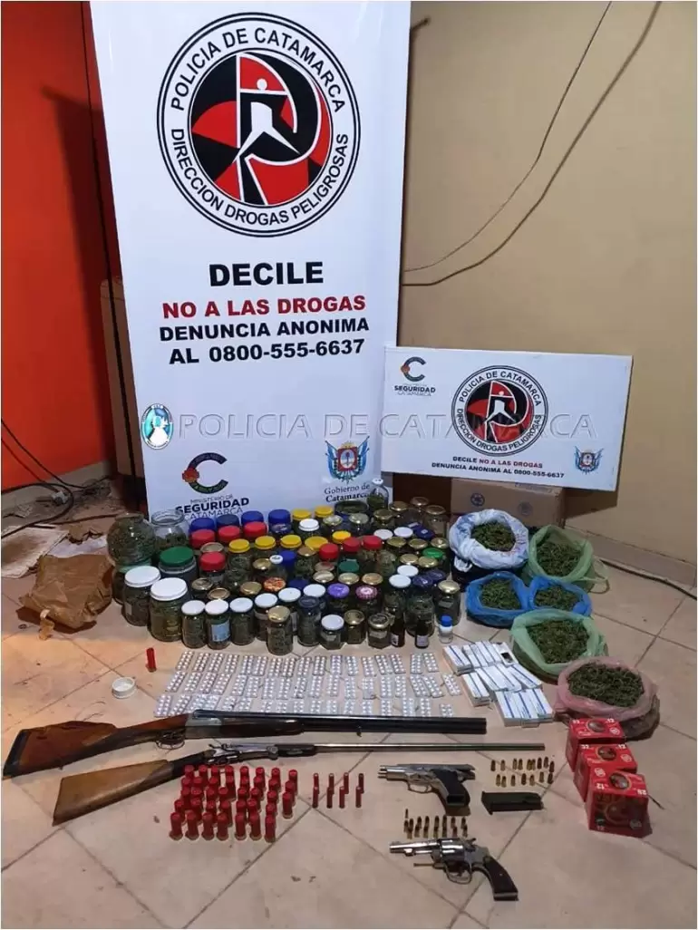 Más tarde, el personal policial interviniente materializó una orden de allanamiento en un domicilio del barrio Soles de Sumalao, de esa localidad del Departamento Valle Viejo, donde incautaron setenta y seis (76) frascos de vidrio conteniendo en su interior una sustancia tipo herbácea compuesta por la flor de la planta de Cannabis Sativa (cogollos), once (11) frascos de plástico conteniendo en su interior la misma sustancia tipo herbácea, un (01) un frasco de metal con la misma sustancia en su interior, cinco (05) bolsas de nylon de distintos colores conteniendo en su interior una sustancia tipo herbácea con un peso de 3,150 Kg., que fue sometida a la prueba de campo orientadora arrojando resultado positivo para probable Marihuana, doscientas dos (202) semillas de Cannabis Sativa, quinientos catorce (514) comprimidos de Rivotril Clonazepam de 2 mg., un (01) plantin de la variedad Cannabis Sativa de 15 cm. de altura, dos (02) escopetas, una calibre 36 y la otra calibre 12 marca Victor Sarasqueta, un (01) revólver Smith and Wesson calibre 38, una (01) pistola Bersa calibre 9 mm., ocho (08) municiones de 36 mm., treinta y ocho (38) municiones de 12 mm., quince (15) municiones de 38 mm., dieciséis (16) municiones de 9 mm., un (01) cartucho de 22 mm., dos (02) frascos de fertilizante y varias bolsas de Nylon.