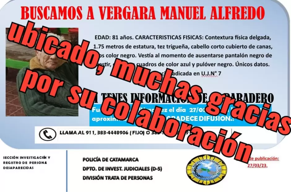Pasada la medianoche, la División de Trata de Personas informó que Manuel Alfredo Vergara, el  octogenario que estaba desaparecido desde el mediodía, ya fue ubicado.