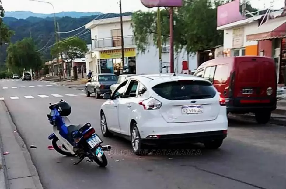 Anoche, a las 20:00, en avenida Los Terebintos, entre calles Las Dalias y Pública sin nombre, se registró un siniestro vial protagonizado por un automóvil Ford Focus, dominio AD596JG, de color blanco, al mando de Evelyn Natali Rasgido (28), que por razones que se tratan de establecer colisionó con una motocicleta Yamaha Crypton azul 110 cc., dominio A127LQU, conducida por Daniel Marcelo Montalbán (23), en compañía de Luis David Carrizo (25).