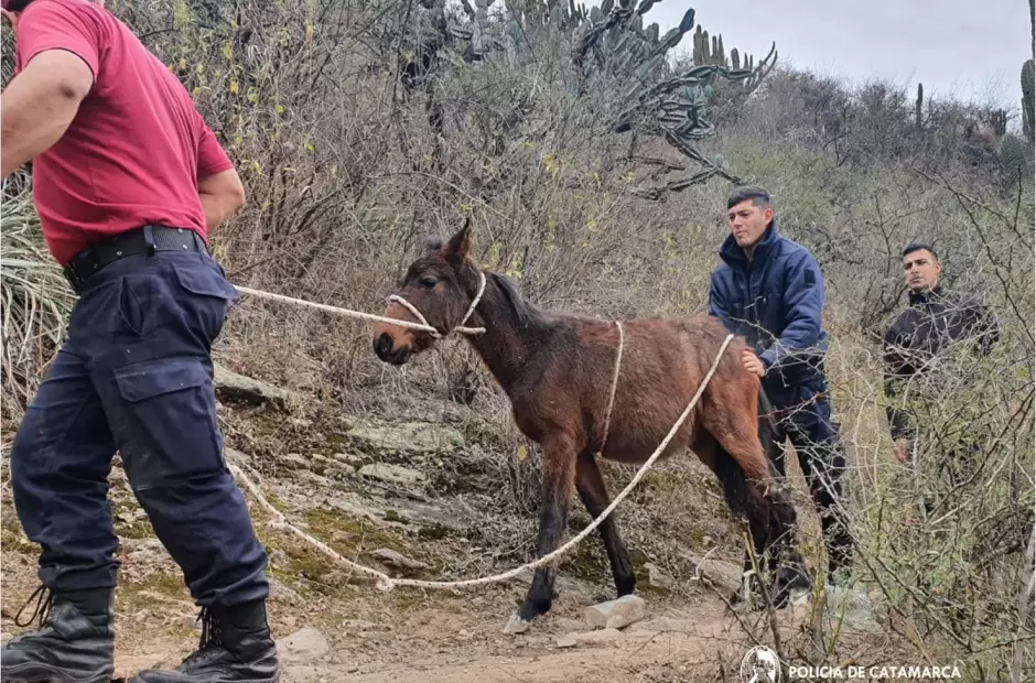 El domingo, pasado el mediodía, más precisamente a las 12:45, a través del SAE-911, personal de la Comisaría Cuarta tomó conocimiento que un caballo había caído en un barranco, ubicado en el sector Oeste del Dique El Jumeal.