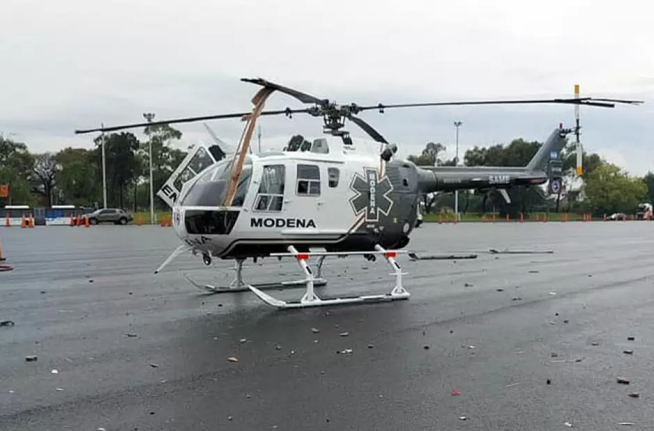 En el momento en que la aeronave se encontraba estacionada sobre el asfalto para asistir al herido, un camión de gran porte tocó el rotor de cola del helicóptero, donde están las hélices, y lo dejó averiado. Por tal motivo, el hombre tuvo que ser trasladado en ambulancia.