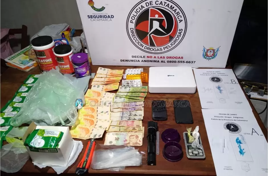 En el lugar, el personal policial interviniente secuestró la suma de diecisiete mil trescientos cincuenta pesos ($17.350) en efectivo, discriminados en billetes de distinta denominación, dos envoltorios de nylon conteniendo una sustancia tipo polvo de color blanco, que luego de ser sometida a la prueba de campo correspondiente se logró establecer que se tratarían de 7 gramos de cocaína, dos teléfonos celulares de distintas marcas y modelos, siete blíster con diferentes pastillas, quince sobres de sulfato de magnesio y tres frascos de creatina, que serían utilizados como elementos para estirar la sustancia estupefaciente, una balanza digital de precisión, una picana eléctrica, una trincheta, un picador, un DVR marca Siera, conteniendo discos de circuito cerrado de televisión adheridos a cuatro cámaras de seguridad, y varios recortes de nylon.