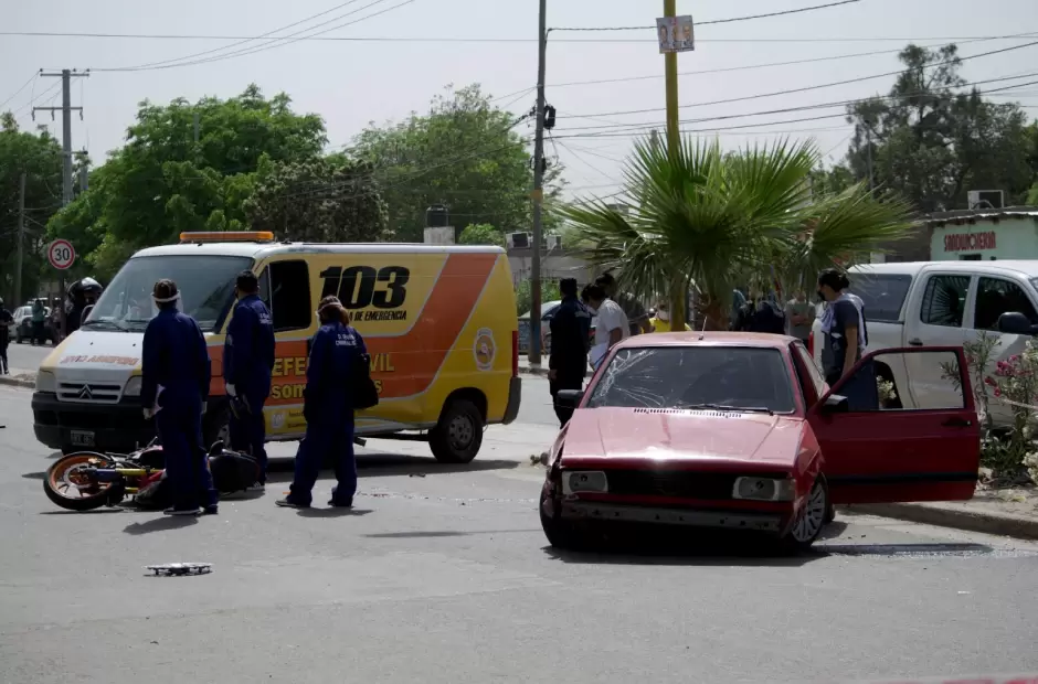El siniestro vial, del que participó también un automóvil, se registró ayer a las 8:00 de mañana, en avenida Choya e intersección de calle Alpatauca y calle Alpachiri, en el barrio Eva Perón, según informaron fuentes policiales. Se supo que un automóvil Volkswagen Gol GL de color rojo dominio ANW-588, conducido por Benjamín Carrizo, de 18 años, colisionó contra una motocicleta marca CB-190 de color naranjada, con detalles roja y blanca, dominio A107QXN, guiada por Braian José Galíndez ( 25 ), ambos protagonistas con domicilio en el barrio Eva Perón.