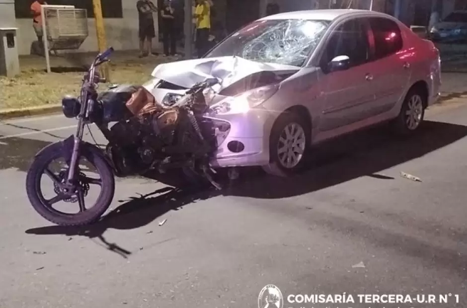 Anoche, a las 23:25, en la esquina de las avenidas Presidente Castillo y N° 34, se registró un siniestro vial. Allí un joven de apellido Andrada (29), circulaba en un automóvil Peugeot 207, de color gris, en compañía de una mujer de apellido Ferreira (30) y, por causas que se investigan, colisionó con una motocicleta Brava 150 cc., al mando de Franco Julián Espeche (25).