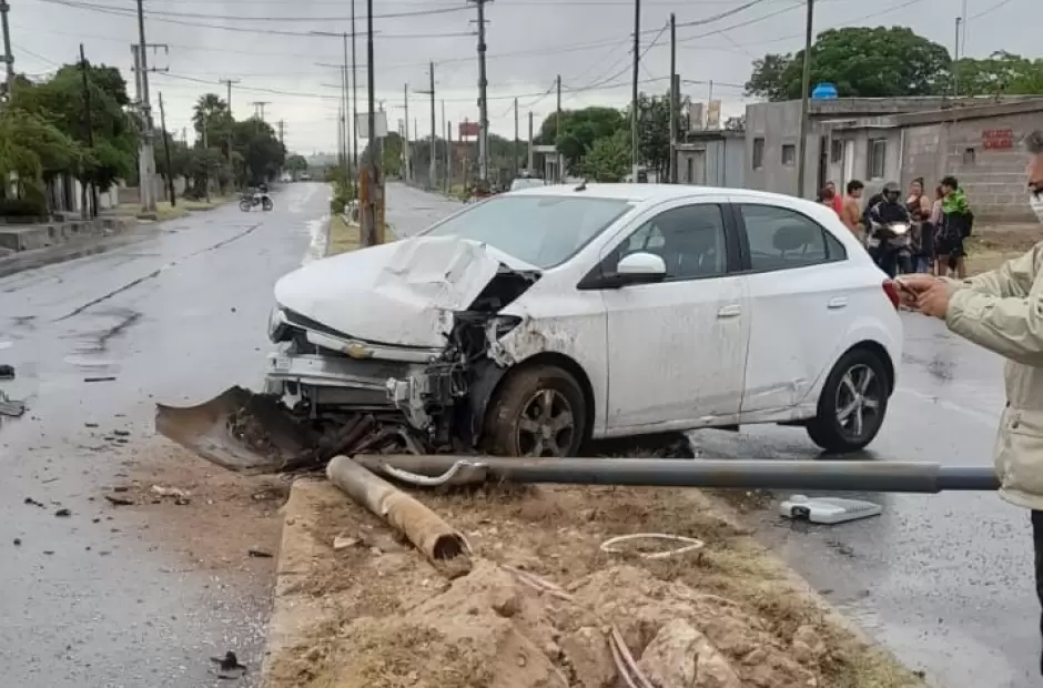 En la mañana de ayer a las 10:15, aproximadamente, la policía fue alertada de un siniestro vial en la intersección de avenida San Juan Bautista y calle Polonia. Al arribar al lugar, los efectivos de la Comisaría Octava observaron un automóvil modelo Onix, dominio AA_990_BX, de color blanco, atravesado sobre la platabanda que divide la avenida con el frente destruido y un poste de luz caído.