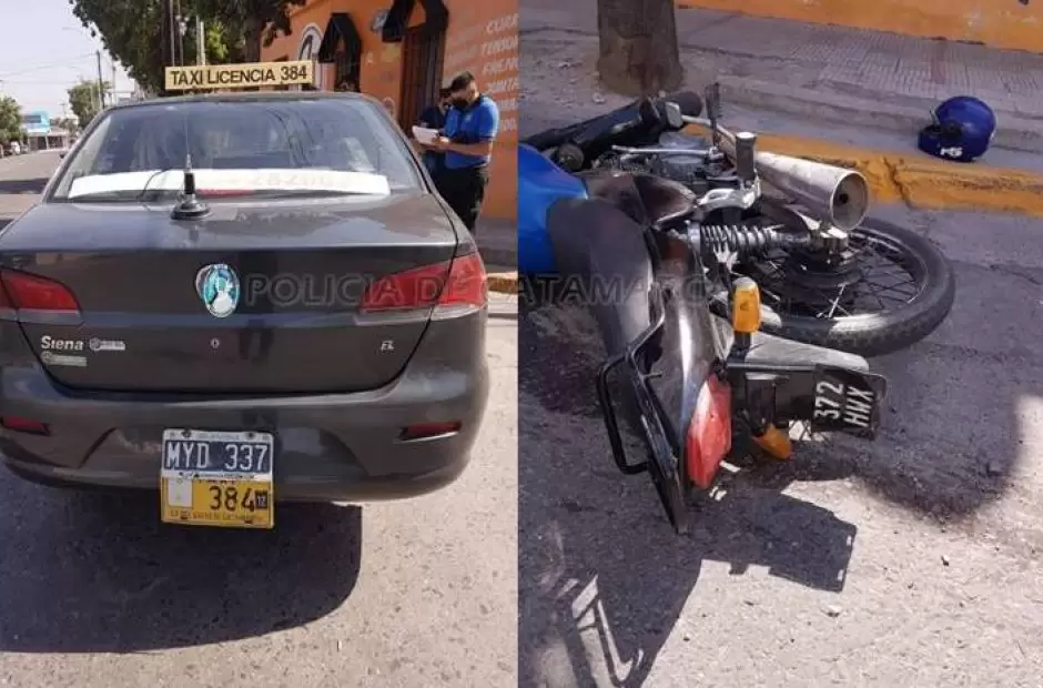 En el lugar, una motocicleta Zanella 150 cc., dominio 372-HWX, de colores azul y negro, al mando de Alexis Alejandro Mercado (24), por causas que investigaban colisionó con un automóvil Fiat Siena verde oscuro, dominio MYD-337, Taxi Lic. N° 384, conducido por Diego Alejandro Nóblega Agüero (34).