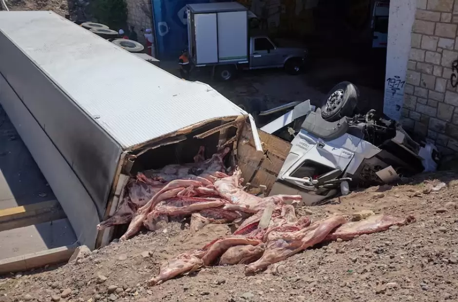 Un camión que transportaba carne chocó con un vehículo utilitario y volcó en la ciudad mendocina de Guaymallén.