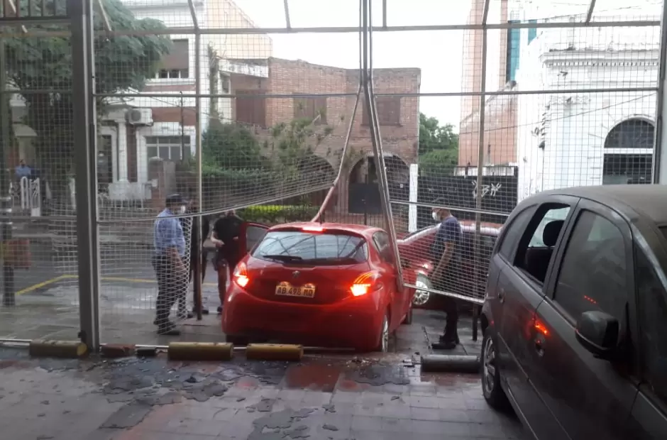Por causas no del todo claras aún para los investigadores, la conductora atravesó literalmente la reja frontal del predio, chocando a otros dos automóviles que estaban estacionados en la vía pública.