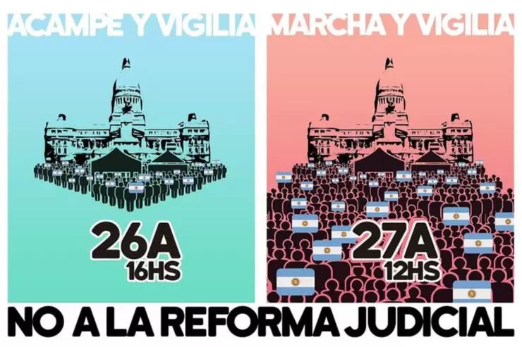 Con el hashtag #26AVigiliaEnElCongreso se informó que cambió la modalidad de la marcha del 26A para repudiar el proyecto de reforma judicial que impulsa el gobierno de Alberto Fernández. En un comienzo se convocó a realizar una movilización hacia el Congreso de la Nación hoy a la tarde. Luego se amplió la medida y se llamó a realizar un acampe nocturno y un abrazo simbólico al Parlamento que se extenderá hasta mañana, cuando la Cámara de Senadores comience a debatir el texto de la ley.