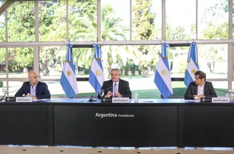 Acompañado por el jefe de Gobierno porteño Horacio Rodríguez Larreta y el gobernador bonaerense Axel Kicillof, el Presidente graba este mediodía el mensaje que luego se emitirá después de las 13. Los dirigentes le pedirán a la sociedad un "esfuerzo más" y harán un llamado a la "responsabilidad".