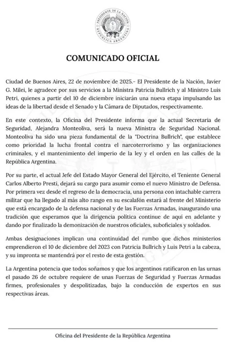Tras anunciar los nombramientos de Alejandra Monteoliva en Seguridad y el Teniente General Carlos Alberto Presti en Defensa, la Oficina del Presidente, Javier G. Milei, emitió un mensaje de despedida a los ministros salientes, Patricia Bullrich y Luis Petri, quienes dejarán sus cargos el 10 de diciembre.
