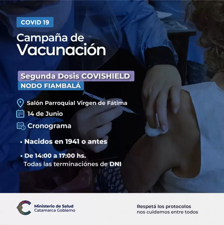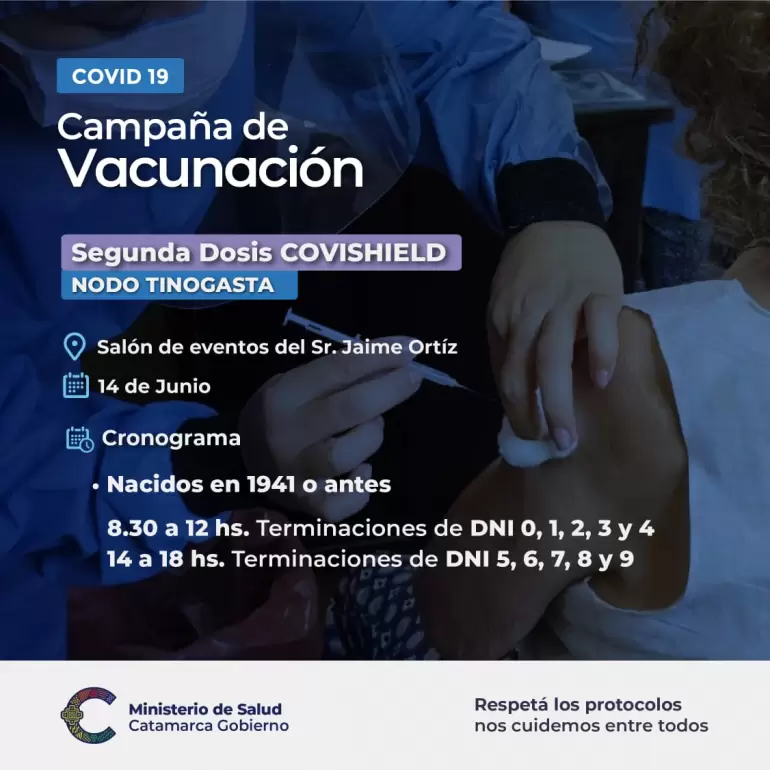 Destinado a personas residentes de Tinogasta y Fiambalá, nacidas en 1941 o antes que ya hayan recibido la primera dosis de esta vacuna.