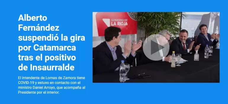 Los medios nacionales se hicieron eco de la suspensión del viaje de Alberto Fernández a Catamarca luego de que se confirmara que el intendente de Lomas de Zamora Martín Insaurralde dio positivo en coronavirus, y que, días atrás, había estado junto con el ministro de Desarrollo Social Daniel Arroyo, que este viernes acompañó al Presidente en si visita a La Rioja.