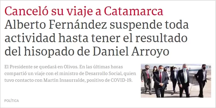 "Alberto Fernández suspendió la gira por Catamarca tras el positivo de Insaurralde", titula TN, la página de uno de los canales de noticias más importantes del país.