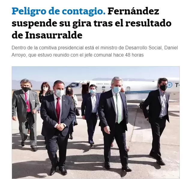 "La noticia de que Insaurralde tiene coronavirus obliga a Alberto Fernández a suspender su viaje a Catamarca", titula el portal Infobae.