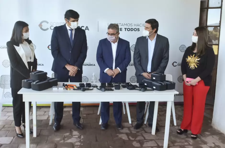 El ministro de Seguridad de la Provincia, Gustavo Aguirre, presentó al Gobernador Raúl Jalil, y a los ministros de la Corte de Justicia, Hernán Martel y Fabiana Gómez, los dispositivos duales para el monitoreo de agresores y víctimas de violencia doméstica en la provincia.