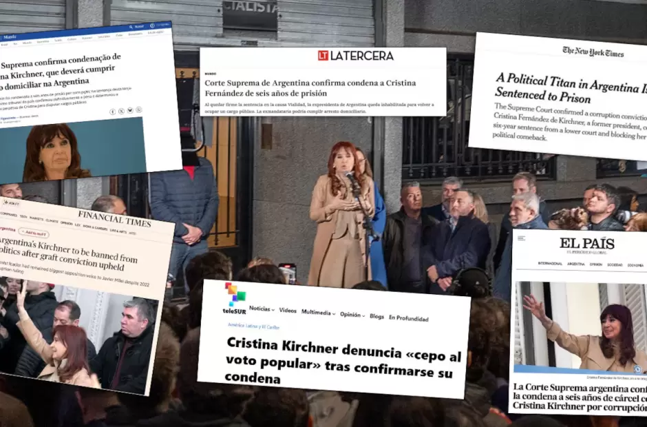 "El fallo sella su carrera política", tituló The New York Times, al describir a Kirchner como una figura "dominante durante más de dos décadas en la política argentina". El País de Montevideo remarcó que la sentencia "cierra el capítulo judicial más relevante de la era kirchnerista". Bloomberg, por su parte, enfatizó que se trata de una "prohibición de por vida" y la interpretó como un mensaje contundente sobre los límites de la corrupción en la función pública.