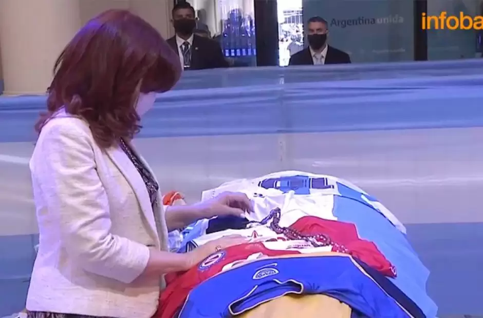 La ex presidenta llegó y, acompañado del primer mandatario Alberto Fernández, y del gobernador bonaerense, Axel Kicillof, se dirigió a saludar a la familia Maradona. Inmediatamente después, Kirchner, Fernández y Kicillof se acercaron al cajón junto a Claudia Villafañe y Dalma y Giannina Maradona.