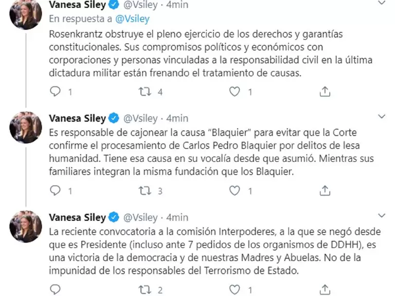 “Rosenkrantz obstruye el pleno ejercicio de los derechos y garantías constitucionales. Sus compromisos políticos y económicos con corporaciones y personas vinculadas a la responsabilidad civil en la última dictadura militar están frenando el tratamiento de causas”, publicó hoy la diputada en sus redes sociales.