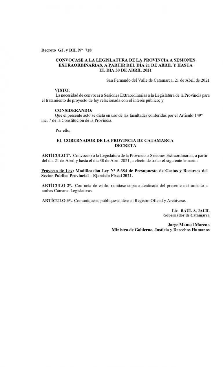 El ministro de Gobierno, Justicia y Derechos Humanos, Jorge Moreno, confirmó que el Poder Ejecutivo provincial convocó a sesiones extraordinarias de la Legislatura provincial a través del Decreto GJ. y DH. N° 738 desde el día 21 de abril y hasta el día 30 de abril a efecto de tratar el siguiente temario: Proyecto de Ley "Modificación Ley N° 5.684 de Presupuesto de Gastos y Recursos del Sector Publico Provincial ? Ejercicio Fiscal 2021".