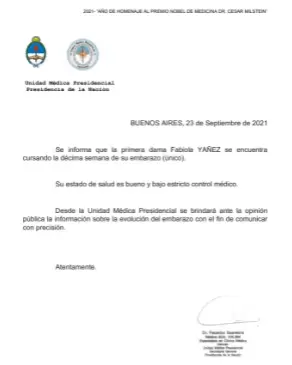 El Gobierno informó que la primera dama, Fabiola Yáñez, está cursando la décima semana de un embarazo. Según el comunicado firmado por el médico presidencial, Federico Saavedra, el estado de salud de la esposa de Alberto Fernández es bueno y se encuentra “bajo estricto control médico”.