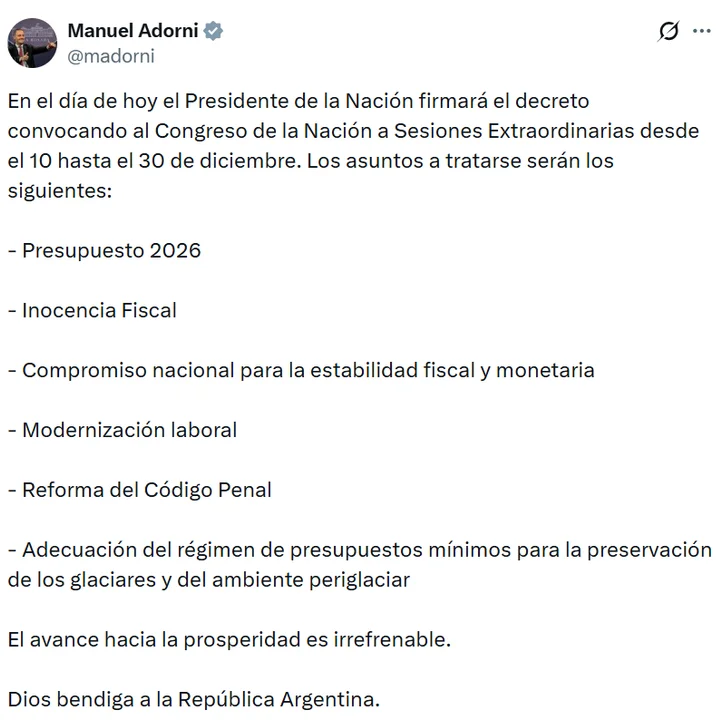 El jefe de Gabinete, Manuel Adorni, anunció este viernes que el presidente Javier Milei firmará en la misma jornada el decreto que convoca al Congreso a sesiones extraordinarias entre el 10 y el 31 de diciembre.
