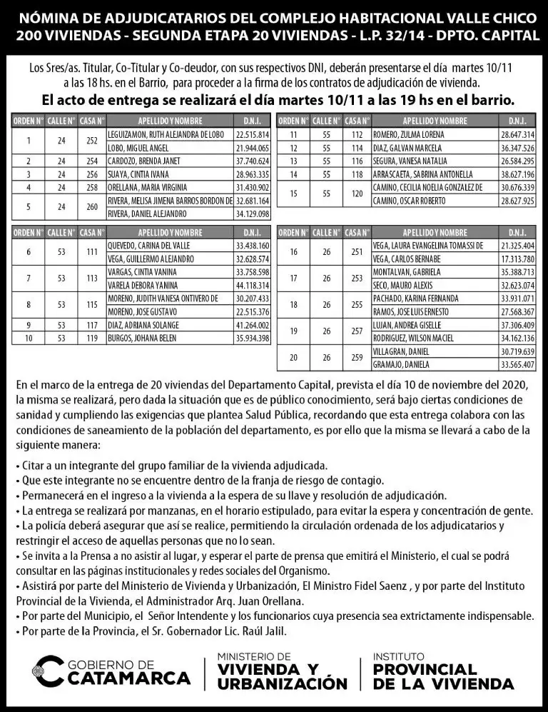 Al igual que la semana pasada, previo a la entrega de viviendas, los titulares, co-titulares y co-deudores para la firma de los contratos de adjudicación de viviendas, deberán presentarse esta tarde, una hora antes del acto, con sus respectivos DNI.
