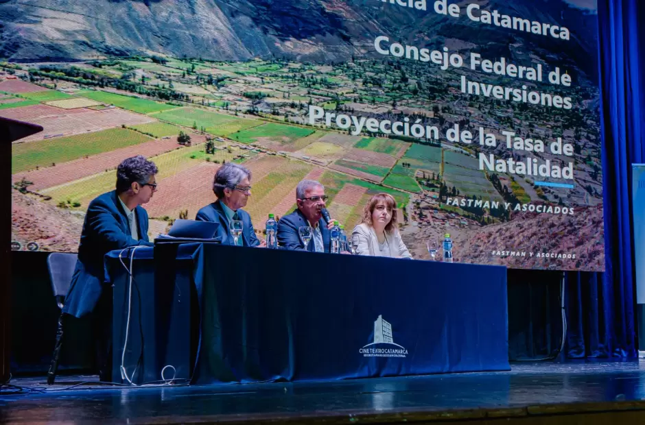 La presentación del "Estudio sobre la Tasa de Natalidad. Proyecciones a 20 años en la Provincia de Catamarca" se realizó en el Cine Teatro Catamarca y estuvo encabezada por el gobernador Raúl Jalil y la ministra de Trabajo, Planificación y Recursos Humanos, Verónica Soria. La disertación estuvo a cargo de los actuarios Bernardo Alberto Fastman y Alejandro Nava, quienes fueron los encargados de elaborar el informe.