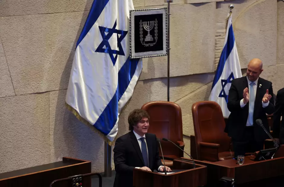 Milei ha expresado su respaldo incondicional al Estado de Israel, calificó a Irán como "enemigo de la Argentina" y declaró a Hamas como organización terrorista. También impulsó la sanción del juicio en ausencia para reactivar las causas judiciales por los atentados a la AMIA (1994) y a la embajada de Israel (1992).