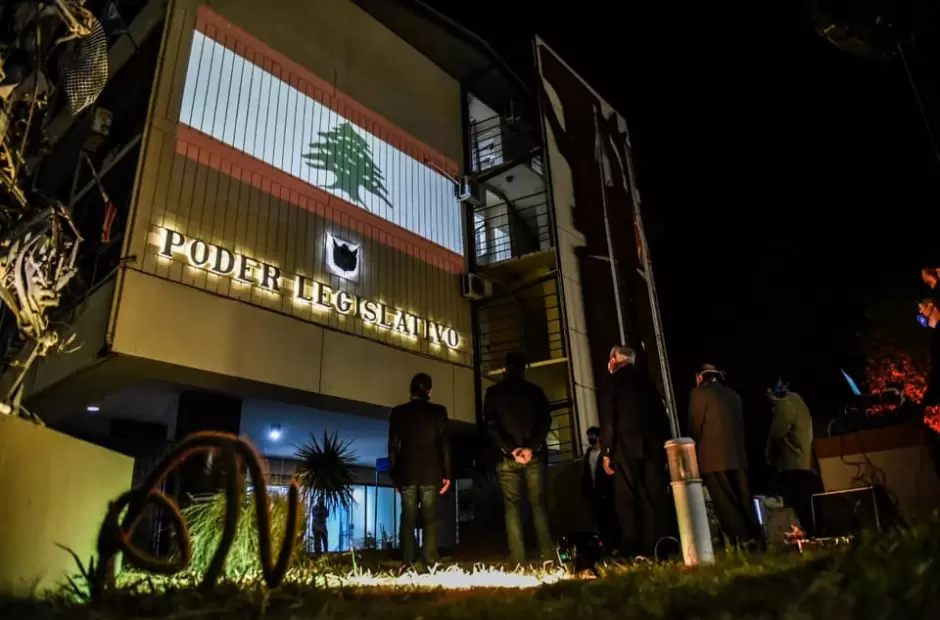 El vicegobernador Rubén Dusso presenció, junto a la presidenta de la Cámara de Diputados, Cecilia Guerrero; el Ministro de Cultura y Turismo, Luís Maubecín; el secretario de Gabinete y Modernización de la Municipalidad de la Capital, Mariano Rosales; y el representante de la Unión Cultural Argentino Libanesa, Dr. Celín Ángel Quintar, la proyección de la bandera del Líbano que se hizo ayer por la noche sobre el Palacio Legislativo, en señal de condolencia hacia los familiares y víctimas de la explosión ocurrida esta semana en Beirut que suscitó un clima de conmoción internacional.