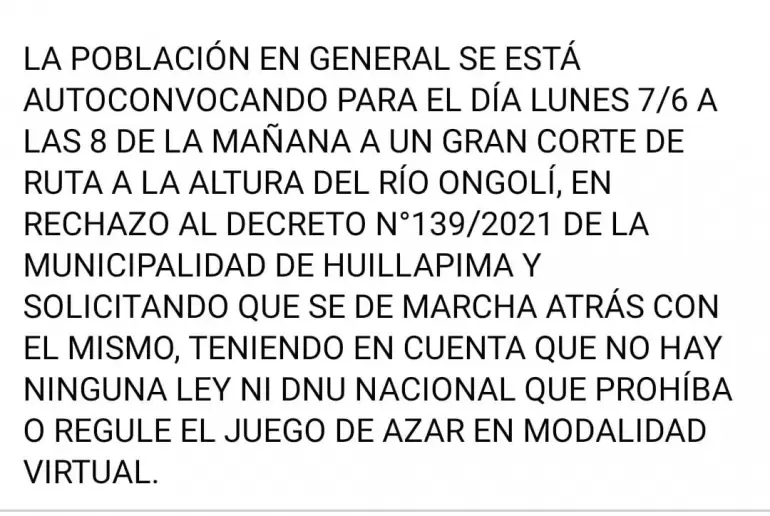 Ante esta situación, entre los habitantes de Huillapima empezó a circular un mensaje a través de WhatsApp en el que organizan un corte de ruta para mañana a las 8, a la altura del río Ongolí, en rechazo al decreto establecido por el intendente Soria.