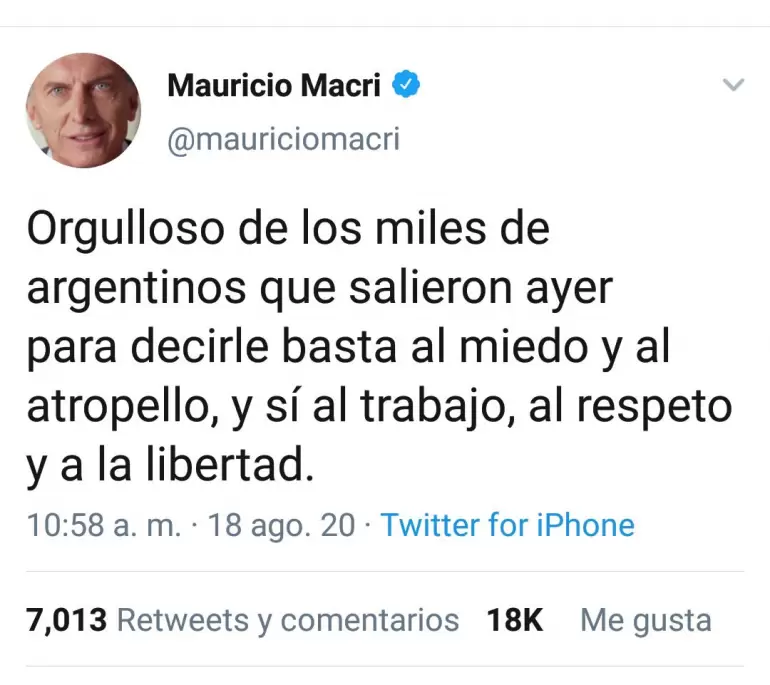 El 9 de Julio pasado, en medio de otra manifestación contra el gobierno nacional, el dirigente opositor había publicado una foto de banderas argentinas acompañada de la frase “¡LIBRES!”. Pocos días antes, en una entrevista concedida al periodista Álvaro Vargas Llosa, había cuestionado el avance de algunos gobiernos sobre las libertades de las personas en medio de la pandemia de coronavirus.