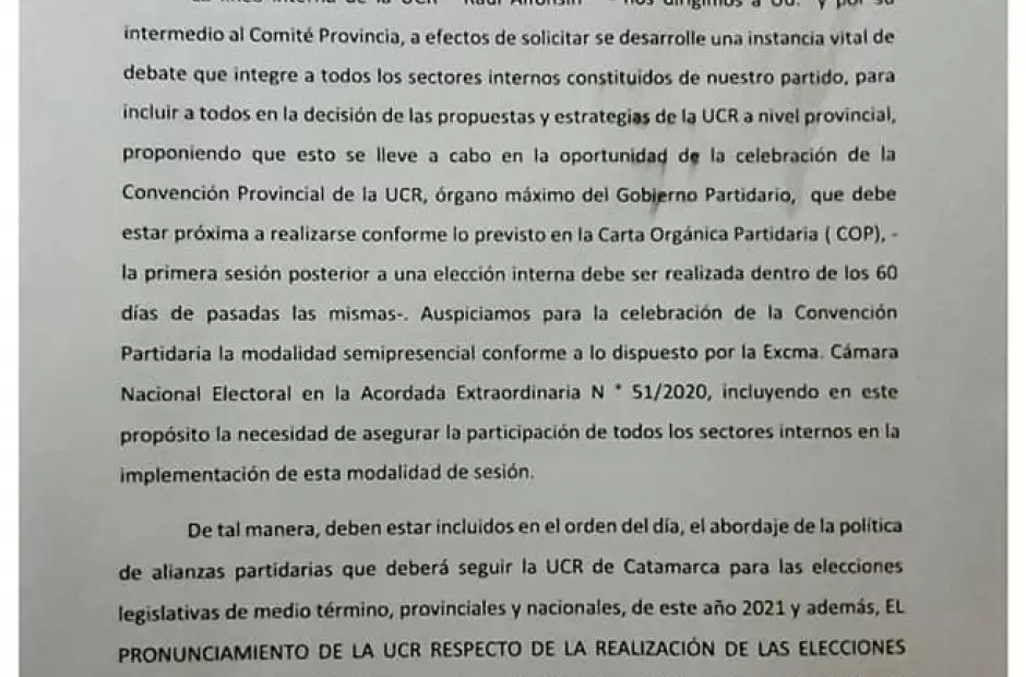 La línea Raúl Alfonsín, que conduce el rector de la UNCA, Flavio Fama elevó una carta a las autoridades de la UCR donde reclama participación dentro de la UCR y definiciones de PASO.