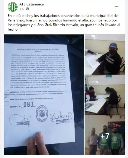 La Asociación Trabajadores del Estado (ATE) informó la noticia a través de sus redes sociales donde confirmaron que los empleados municipales fueron reincorporados firmando el alta: “En el día de hoy los trabajadores cesanteados de la Municipalidad de Valle Viejo, fueron reincorporados firmando el alta, un gran triunfo llevado al hecho!!!”, indicaron.