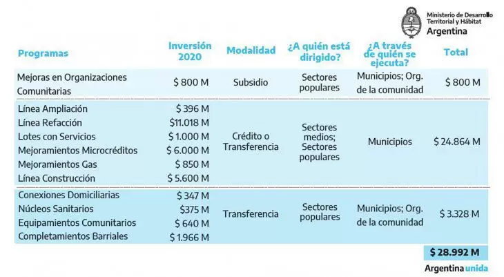 Se trata de un programa pensado para la reactivación económica, en esta etapa de fuerte caída de la producción, que contará con 11 líneas de acción por un total de $29.000 millones, para la construcción de 5.500 nuevas viviendas que se suman a las más de 30.000 en las que el Estado ya está trabajando.