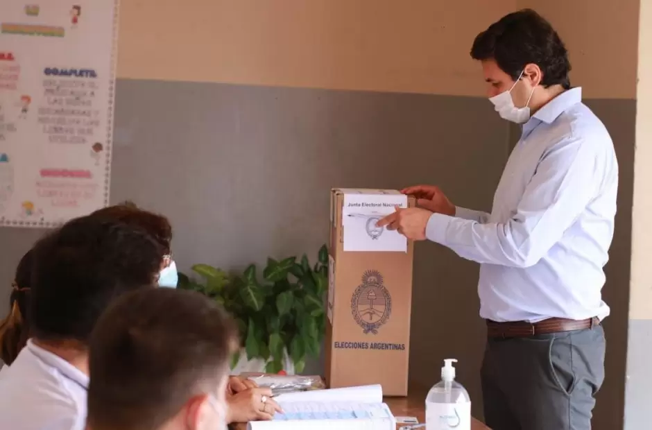 El candidato a diputado provincial por el Frente de Todos Gustavo Aguirre emitió su voto alrededor de las 9:30 en la escuela en la Escuela N°493 de Villa Parque Chacabuco.
