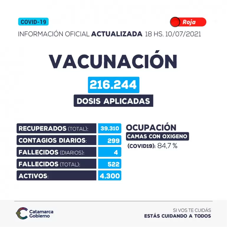Hasta las 18 horas del sábado 10 de julio se detectaron 299 nuevos casos positivos de coronavirus en la provincia de Catamarca. El total acumulado de casos positivos detectados asciende a 44.132.