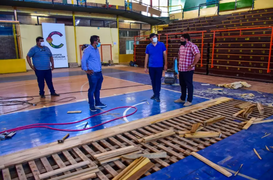 Comenzaron las obras de mantenimiento y reparación del piso de parquet del Estadio Principal del Polideportivo “Fray Mamerto Esquiú”, y el Secretario de Deportes y Recreación Daniel Lavatelli junto a los Directores Provinciales de Deporte Social Luis Robledo y de Asistencia Deportiva Gustavo Bazán recorrieron el avance de las tareas, que se están realizando con el aporte del Ministerio de Vivienda y Urbanización, que dirige Fidel Saenz y la colaboración del arquitecto Juan Orellana. También, se reparará el piso de las canchas del estadio Auxiliar.