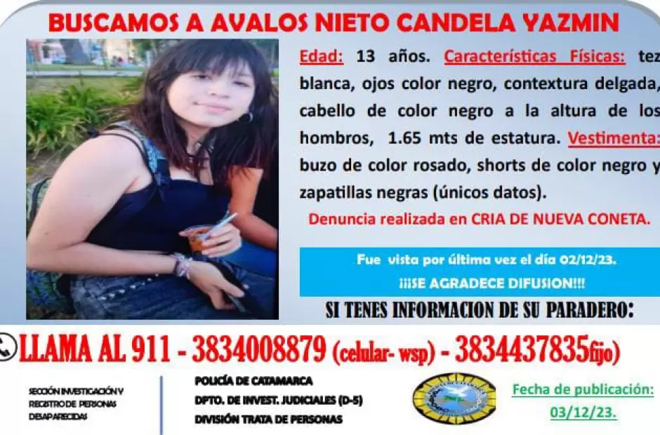 Candela Yasmin es de tez blanca, ojos color negro y contextura delgada, llevando cabello de color a la altura de los hombros. La última vez llevaba puesto buzo de color rosado, short negro y zapatillas negras. Su familia formuló la denuncia en la Comisaría de Nueva Coneta.
