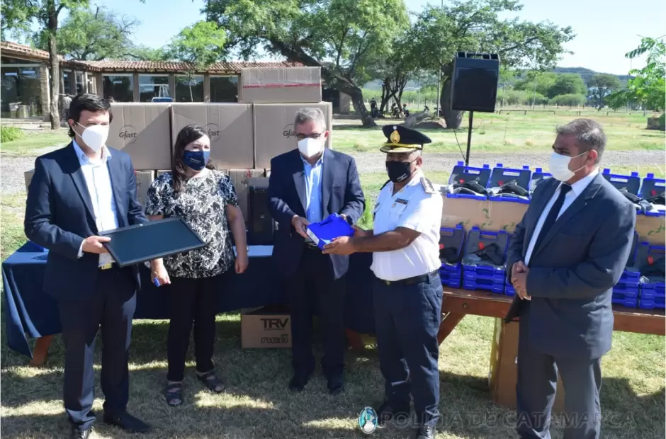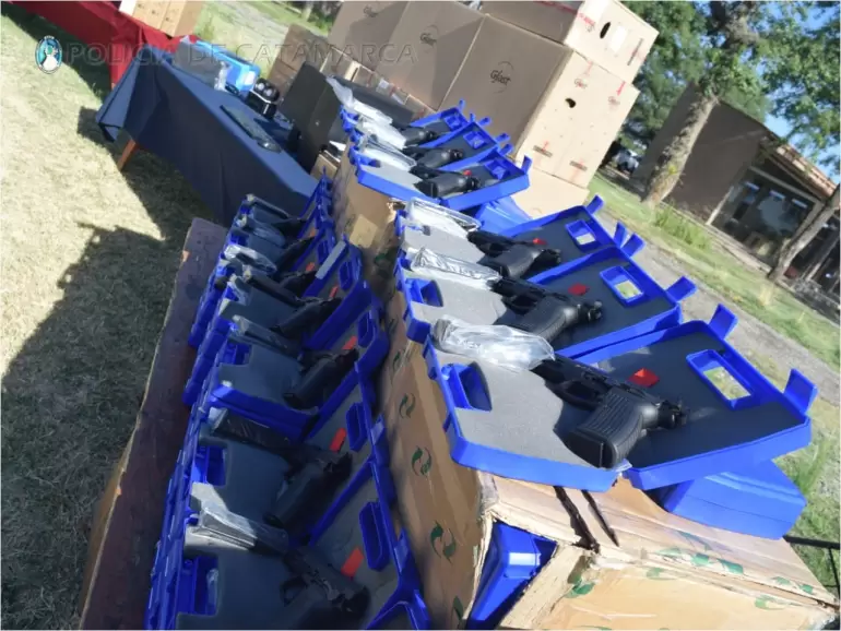 En la oportunidad, el Sr. Gobernador de la Provincia, Lic. Raúl Jalil, la Presidenta de la Cámara de Diputados, Dra. Cecilia Guerrero, el Ministro de Seguridad, Dr. Gustavo Aguirre, el Secretario de Seguridad Dr. Martín Miranda, junto al Sr. Jefe de Policía, Crio. Gral. (RE) Lic. Ángel Ignacio Agüero, y el Sr. Subjefe de Policía, Crio. Gral. Sergio Agustín Lazarte, hicieron entrega de catorce (14) computadoras HP con pantallas de 18,5”, que serán destinadas a equipar unidades operativas de la Policía, como así también se hizo entrega de cuatrocientas setenta y siete (477) pistolas 9 mm. marca Bersa TPR-9 destinadas a los Agentes de Policía recientemente egresados.