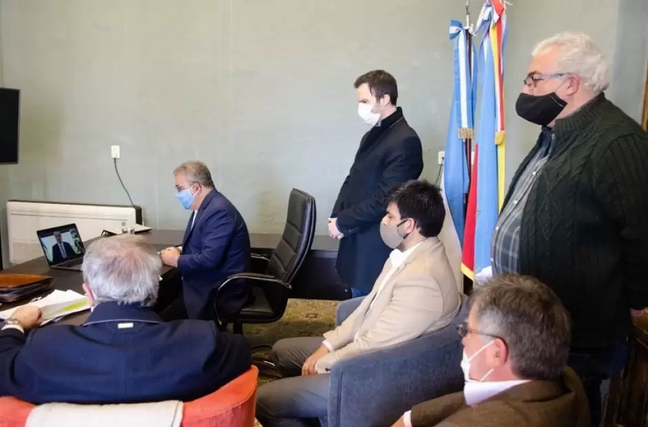 El gobernador Raúl Jalil y el vicegobernador Rubén Dusso junto al equipo de Gobierno dialogaron con el embajador en Brasil, Daniel Scioli, en una videoconferencia realizada hoy en la sede del Poder Ejecutivo.