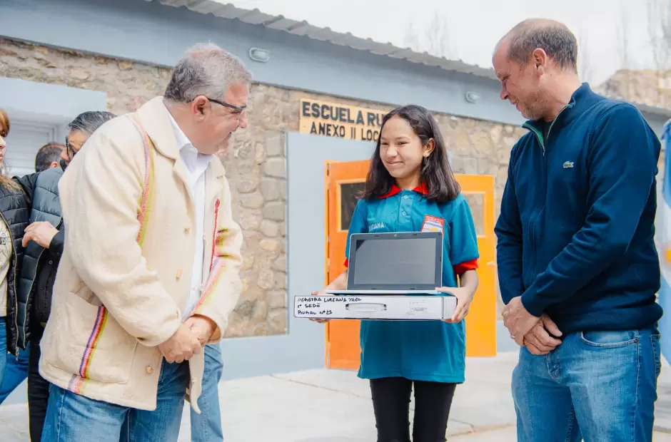 Durante la ceremonia, el mandatario junto a la ministra Andrea Centurión entregaron 14 notebooks como parte del programa "Sigamos Conectados", una iniciativa impulsada por el Gobierno Provincial con el objetivo de garantizar el acceso a la tecnología para todos los estudiantes, especialmente aquellos que residen en las áreas más remotas de la provincia. También, se entregaron cocina y heladeras para la comunidad educativa.