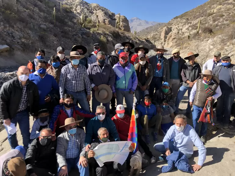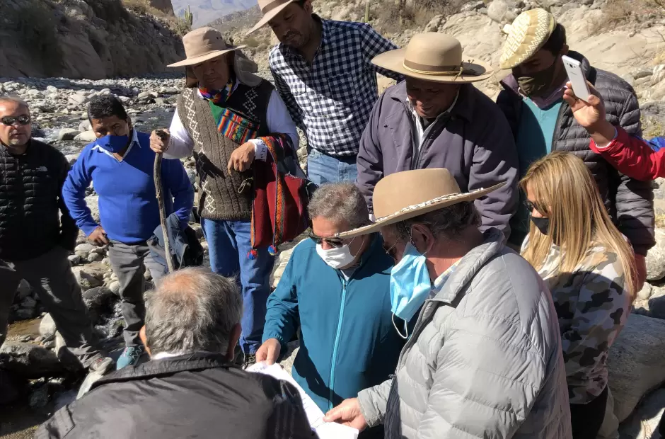 El mandatario y los jefes comunales llegaron a caballo al lugar principal donde se podrían emplazar las primeras tomas de agua para luego caminar por el cauce seco de la hoya que serviría como espacio para el almacenamiento del embalse.