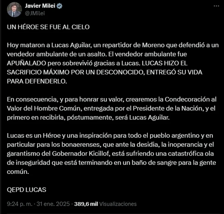 "En consecuencia, y para honrar su valor, crearemos la Condecoración al Valor del Hombre Común, entregada por el Presidente de la Nación, y el primero en recibirla, póstumamente, será Lucas Aguilar", agregó.