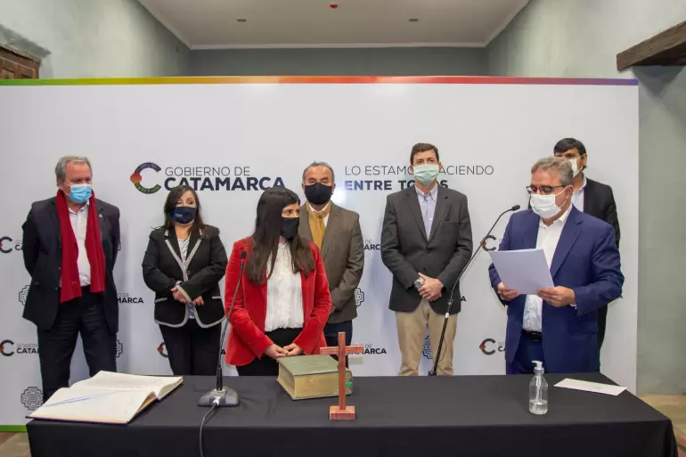 El gobernador Raúl Jalil, acompañado por el vicegobernador Rubén Dusso y la presidenta de la Cámara de Diputados, Cecilia Guerrero, tomó juramento a las nuevas autoridades del ministerio de Minería y la Asesoría General de Gobierno.